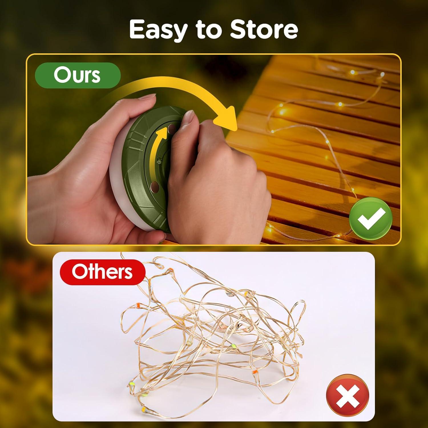 Portable Storage: The camping light is only 7.4 ounces, very lightweight and portable, it can be easily put into a backpack or handheld device, a quick turn of the handle and the manual device ,32.8FT string lights can resume the camping light in only 30 seconds. The clever design of the string lights for camping ensures portable storage. Undoubtedly a camping essentials.