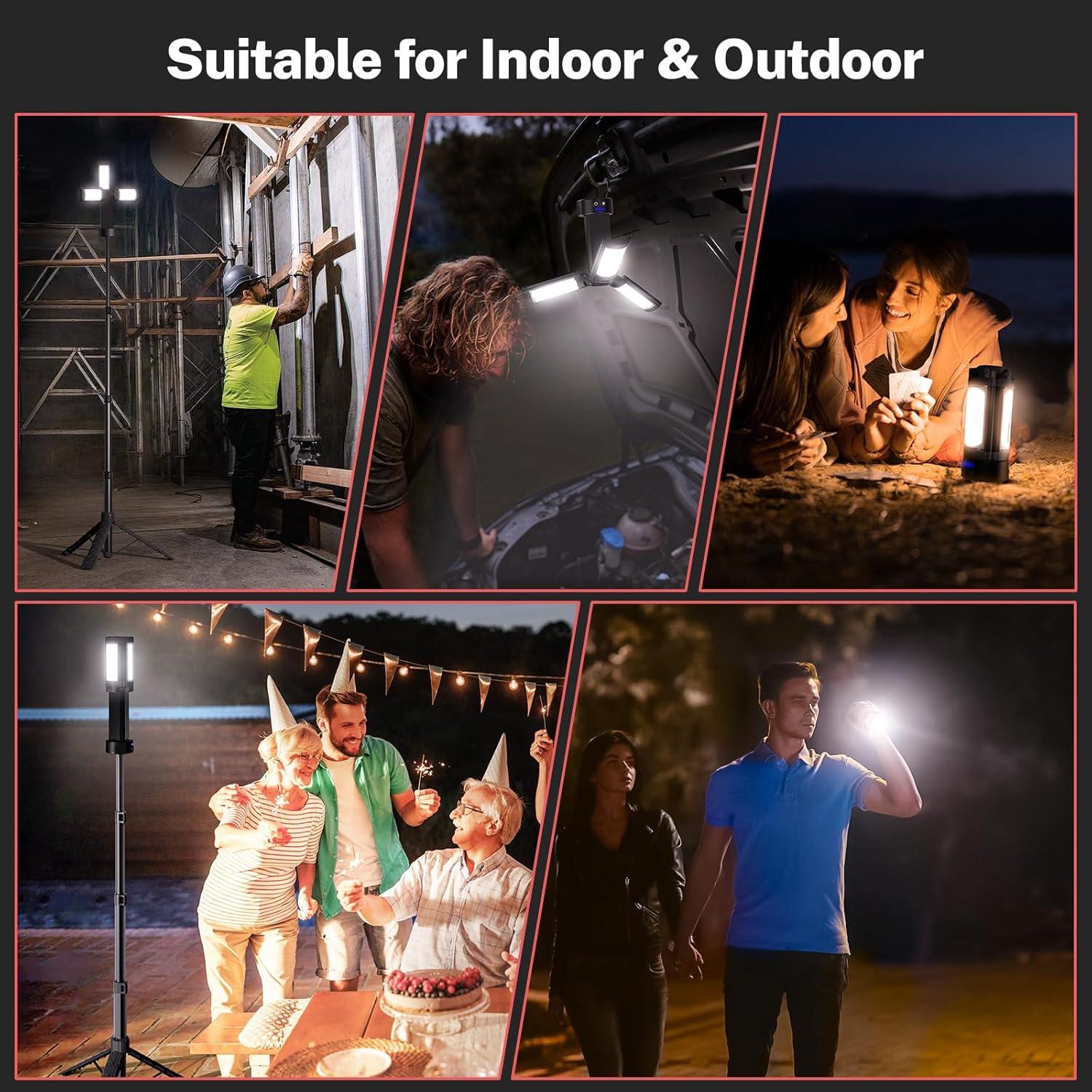 Compact and Portable: Weighing just 4.6 lbs, this magnetic work light is foldable to 20.94 inches for easy storage and transport. The adjustable stand extends from 29.13 inches to 78.34 inches, accommodating various heights. Its wireless design and detachable lamp heads make it a perfect camping light or work light for indoor and outdoor use.